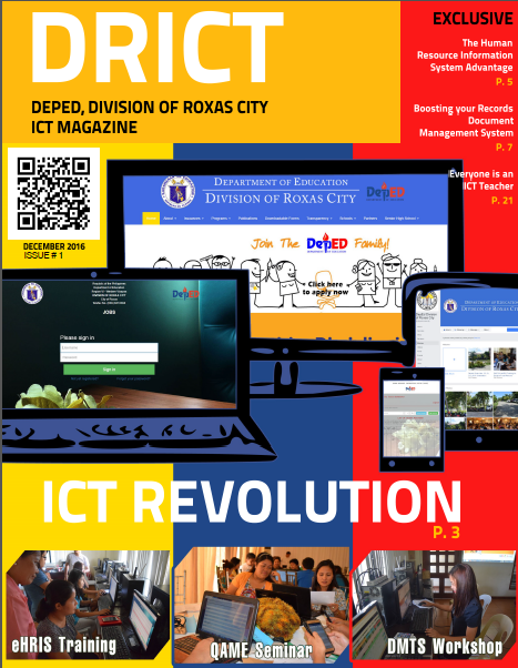 This is the first issue of DRICT and we invite you to take a journey with us in revolutionizing ICT in Education in DepEd, Division of Roxas City.Information is free and the medium of sharing is limitless. With this, the principle of DRICT was born. In this issue, we feature the ongoing ICT strategies we are implementing in the division. From the division initiative systems — mainly the Document Management and Tracking System (DMTS), Personnel Services Management System (PSMS aka HRIS), Jobs at Division of Roxas City, Quality Assurance and Monitoring Offline System and New and Improved Division Website — to the ICT Literacy Skills Workshops for Teachers and Division Personnel.